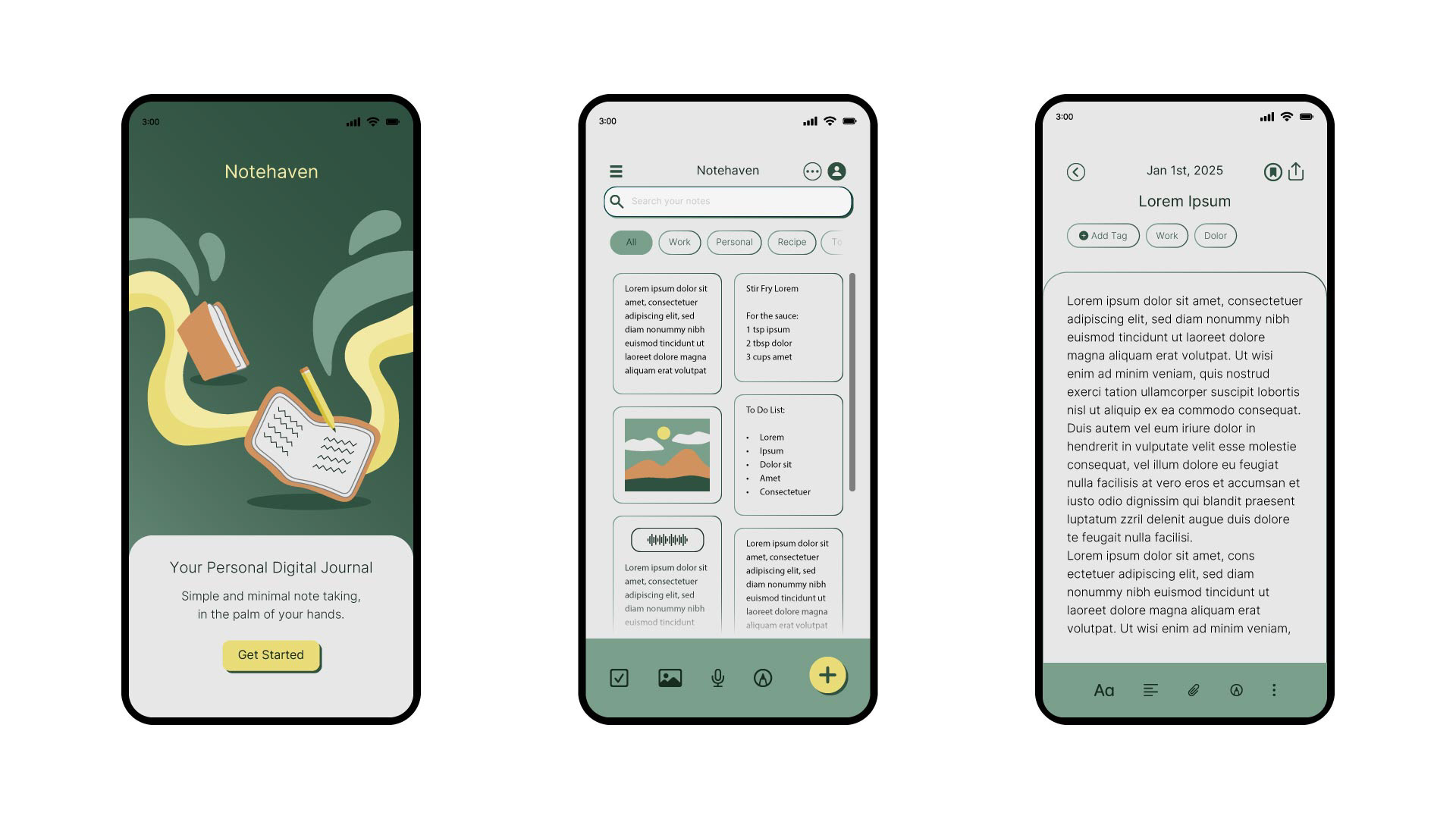 Notehaven is a conceptual journal app, created as a design exercise to practice building functional, user-friendly interfaces from scratch, combining functionality with my aesthetic direction.