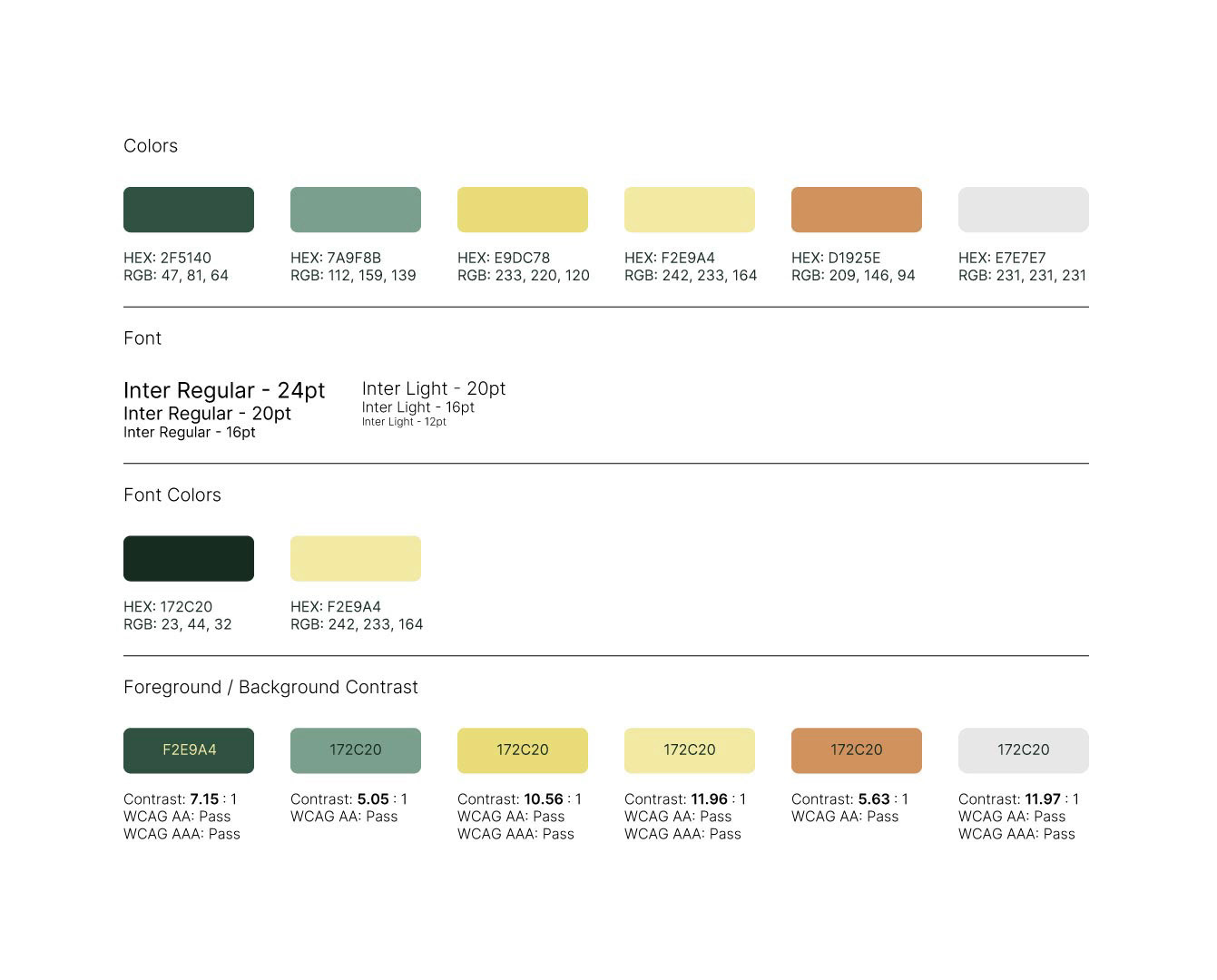 This basic style guide ensures accessibility with WCAG-compliant color contrasts and clear typography, with a type scale ranging from 12pt to 24pt.